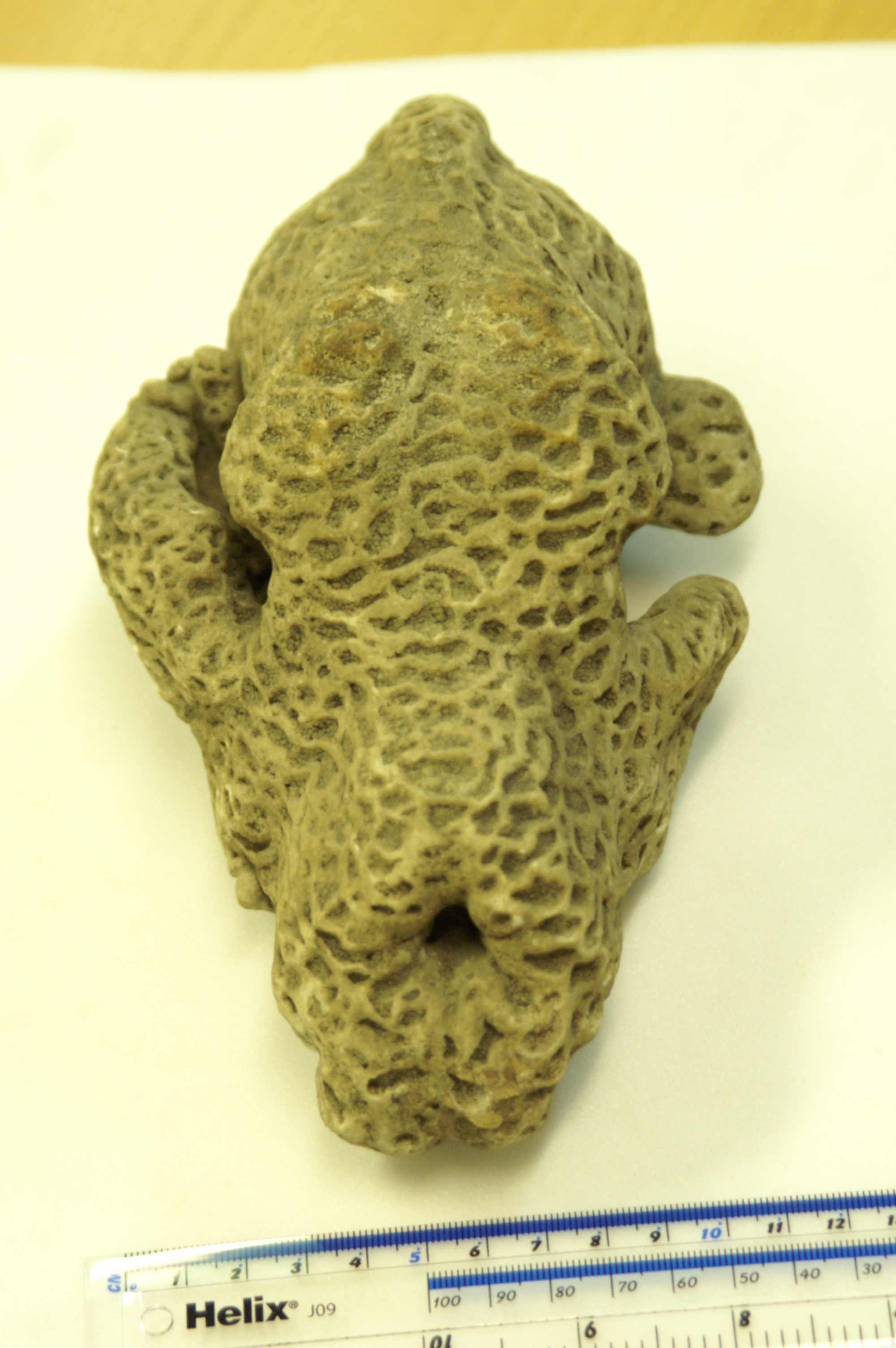 I thought that Dave Godfrey was going to get it almost straight away with his carnivoran from a cave deposit, but fortunately for the agents of chaos opinion started to drift toward it being a coral and from there to a piece of Damien Hirst’s prep work and on to a dead rabbit covered in tripe. However, SmallCasserole came so close that I think I have to say he got it. It is indeed a dog’s head that has been calcified, but probably not at Mother Shipton’s Cave (or more accurately at the Petrifying Well) since it doesn’t have the ‘smooth’ (although still quite rough) and drippy texture associated with the flowstone tuffa deposited there, where items are suspended for petrification. This was more likely to have been calcified at the Matlock Bath Great Petrifying Well which used a fountain to spray items placed on a surface with the mineral enriched waters that allow calcium carbonates to be rapidly depositied. This dog skull probably took less than a year to become this heavily calcified. Imagine what that water would do to your kettle…