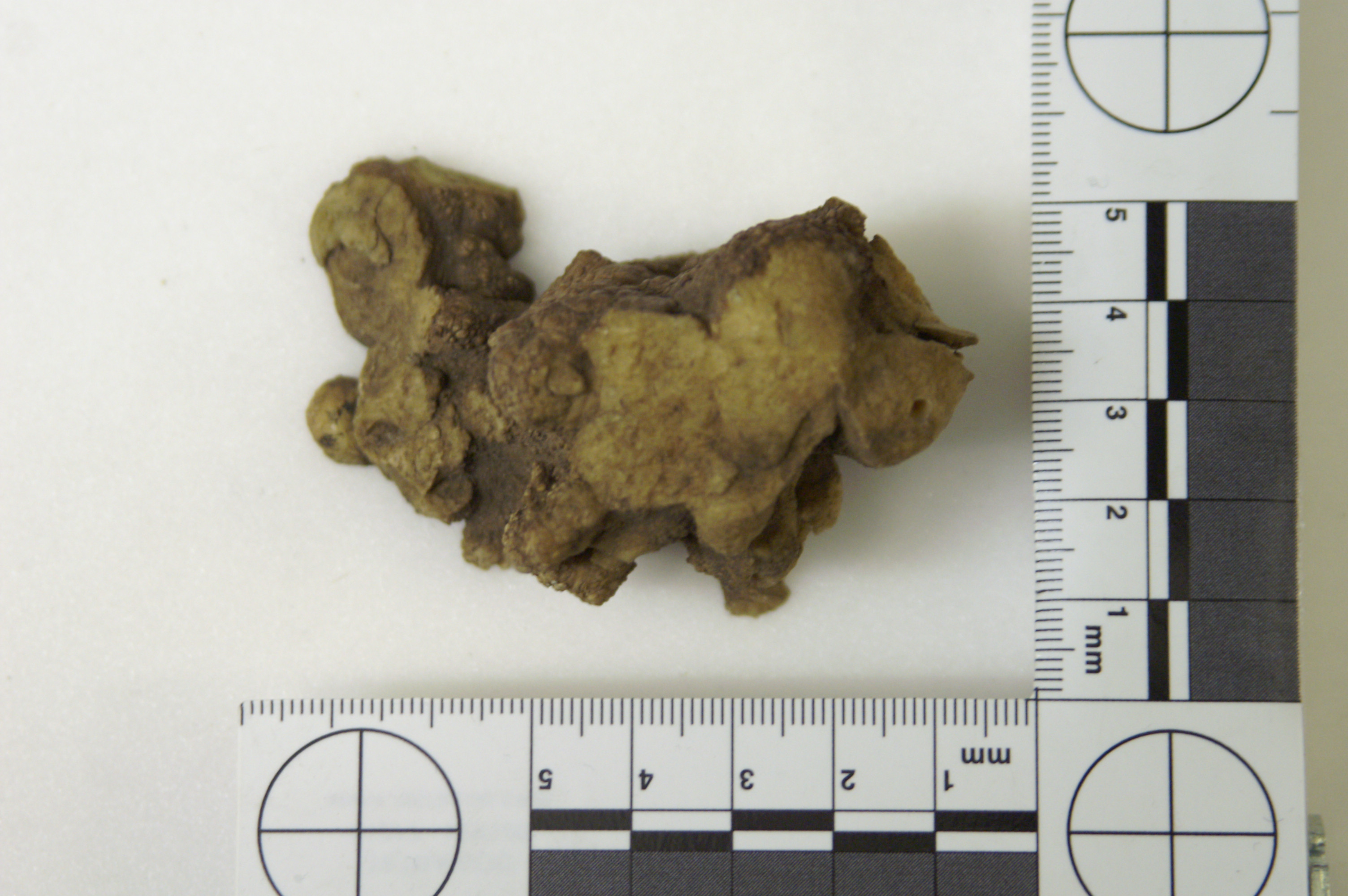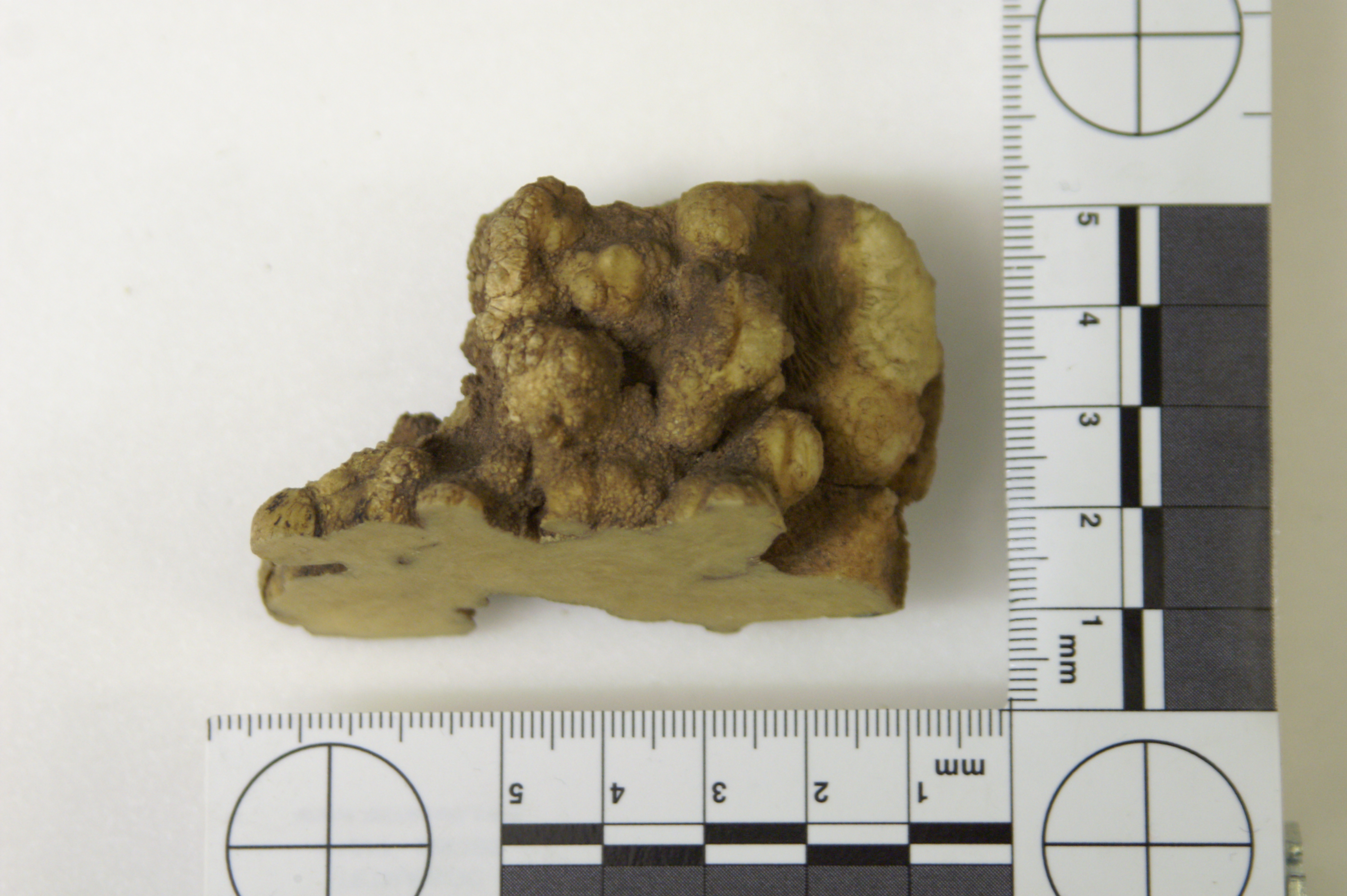 So, it’s animal and mineral with a splash of bacterial. Not antler, hairy, truffle, earwax, gallstone, coprolite or fossilized. Jim’s suggestion of a calcified granuloma went unchallenged. I’d have to agree – but what is the texture of the thing? Is it hard, soft, heavy, light, spongy…?
