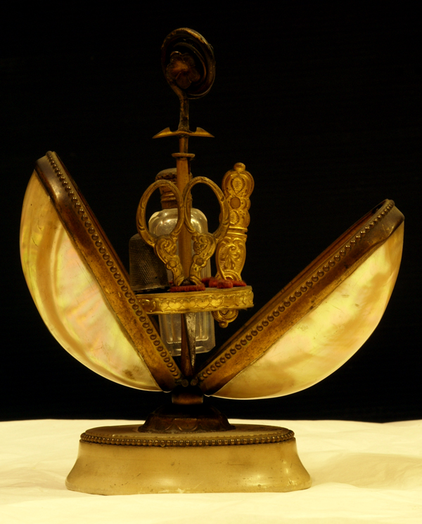 Dave Godfrey immediately recognised that the two halves of this egg-shaped object fold down and likely contained something inside. What the two halves were made from was hinted at by Raymond Ho and Steven D. Garber, PhD (who recognised that it was derived from molluscs) and was explicitly identified by by Dave Godfrey as being mother-of-pearl (or nacre as it’s also known). Jonpaulkaiser went a step further and identified that the nacre came from the shells of Nautilus pompilius Linnaeus, 1758 (which Dave Godfrey seconded). This is the best identification I can come up with as well, since it fits with the nature of the nacre (or I should say osmena) – it’s too ‘pearly’ and not iridescent enough to be from an Abalone (Haliotis sp.), it also lacks the respiratory holes (as noticed by Zigg).