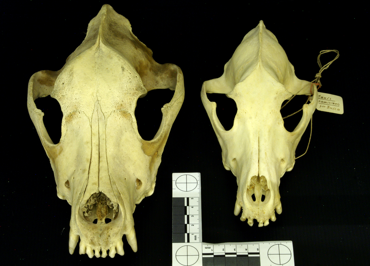Domestic dogs show a remarkably diverse range of sizes – consider that a Chihuahua’s entire bodylength can be shorter than the length of the skull of the Newfoundland. Just comparing this specimen with a ‘normal’ sized Collie-type skull shows a remarkable difference in scale: