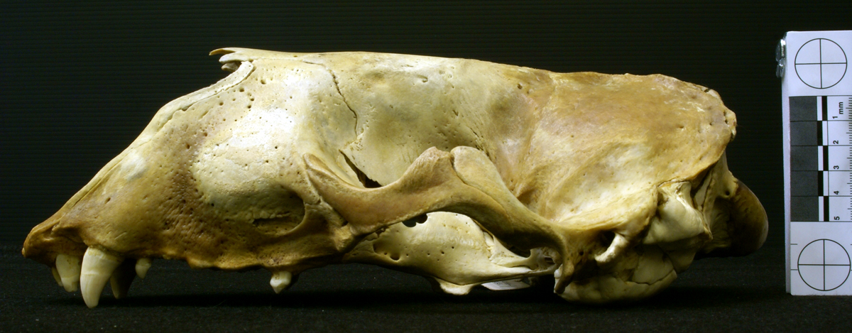 This week I have a specimen from the Horniman stores for you to take a shot at identifying. It’s missing some teeth and the mandible, which might make it a bit harder than usual, but the shape is very distinctive, so I expect someone will get it pretty quickly: