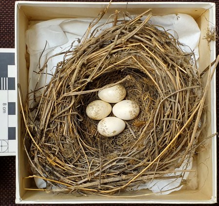Clearly passerine/songbird eggs. Size, shape and coloration suggest northern mockingbird (Mimus polyglottos) but the pattern of speckles and splotches isn’t quite right. I suppose this is a Eurasian species, so that would be rather outside of my experience.