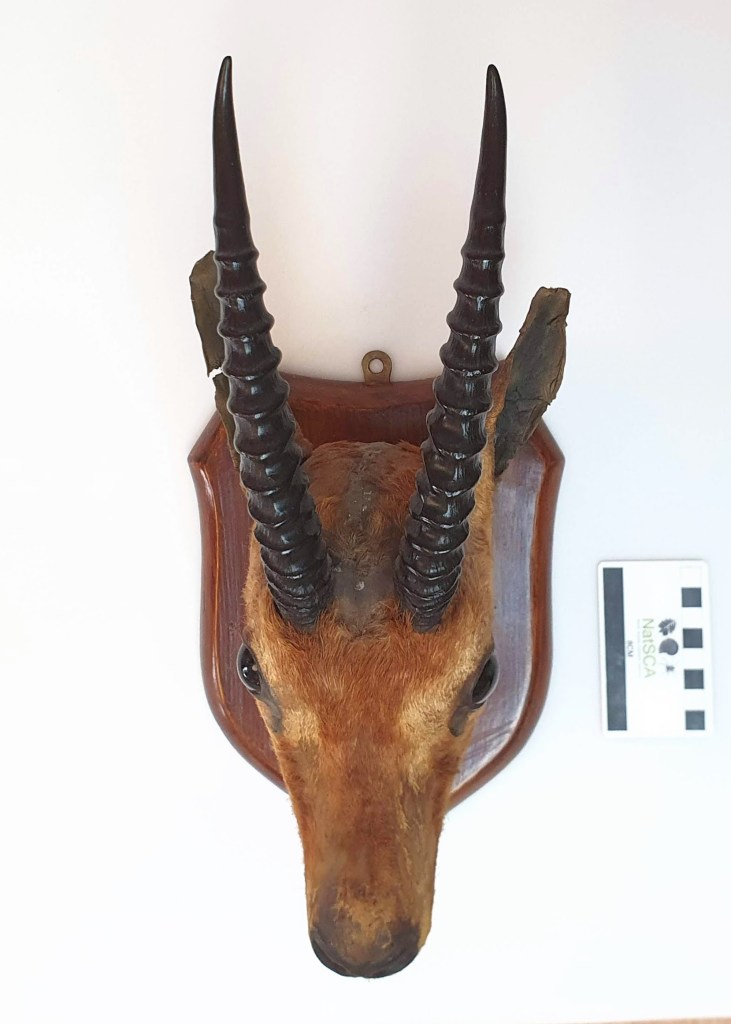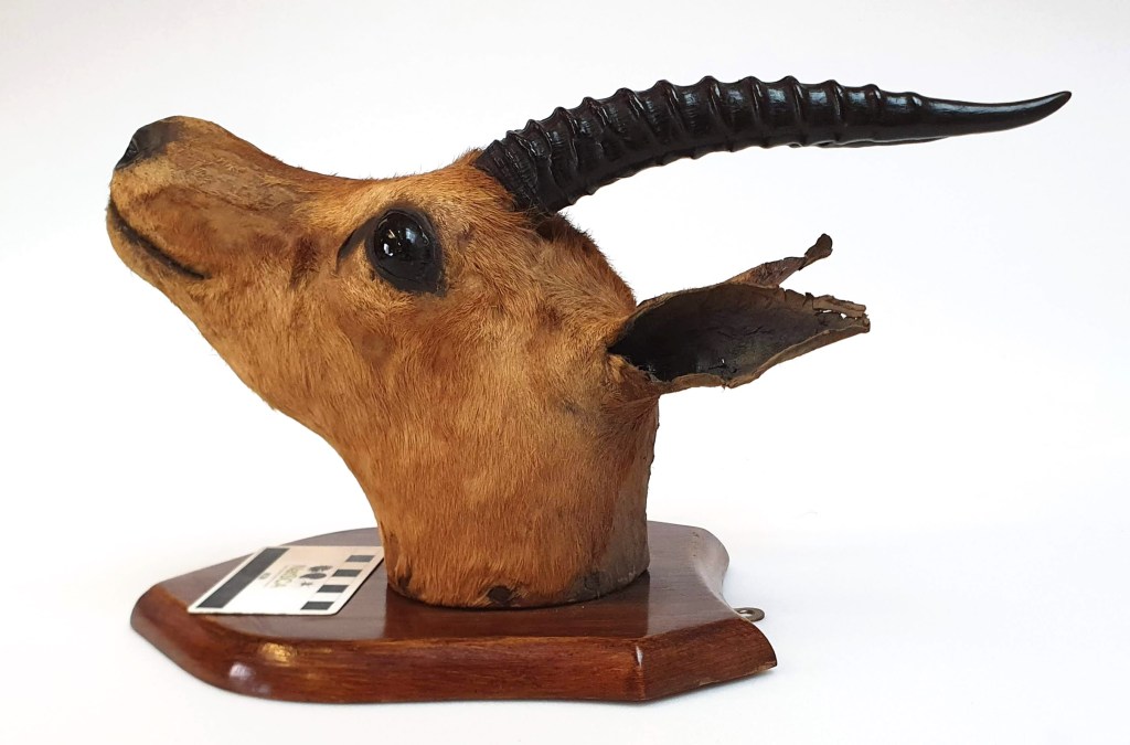 Palfreyman1414 and salliereynolds made the inital observation that this is an ungulate, but there are very many ungulates and that doesn’t narrow it down by much. Goatlips went on a bit of an adventure with Major St. Leger Moore and found some useful information – the Major served in the 9th Lancers who were posted to India during his service, in which time he picked up polo (which he was apparently involved in appropriating for Britain) and most likely this particular trophy.