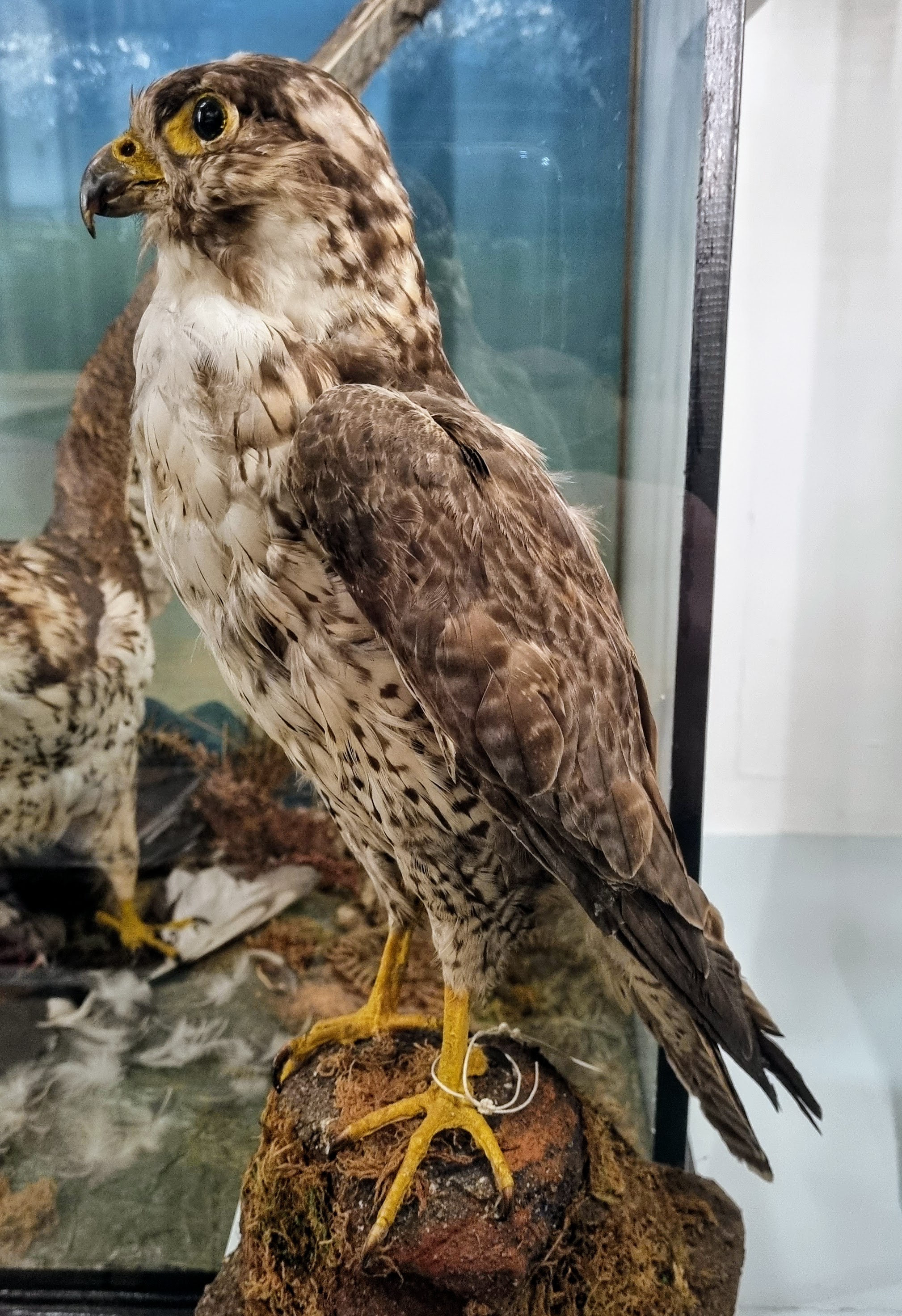 That jet engine seems to be missing its tubercle. Yellow cere and feet indicate adults. Really long wings, almost to the end of the tail. Taxidermy specimens always seem so – messy. The subtle colorings get confused. Could be an extinct species. Or one from my back yard that had a rough trip from Mexico.