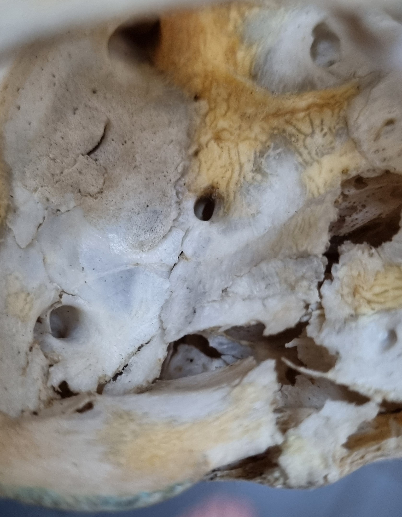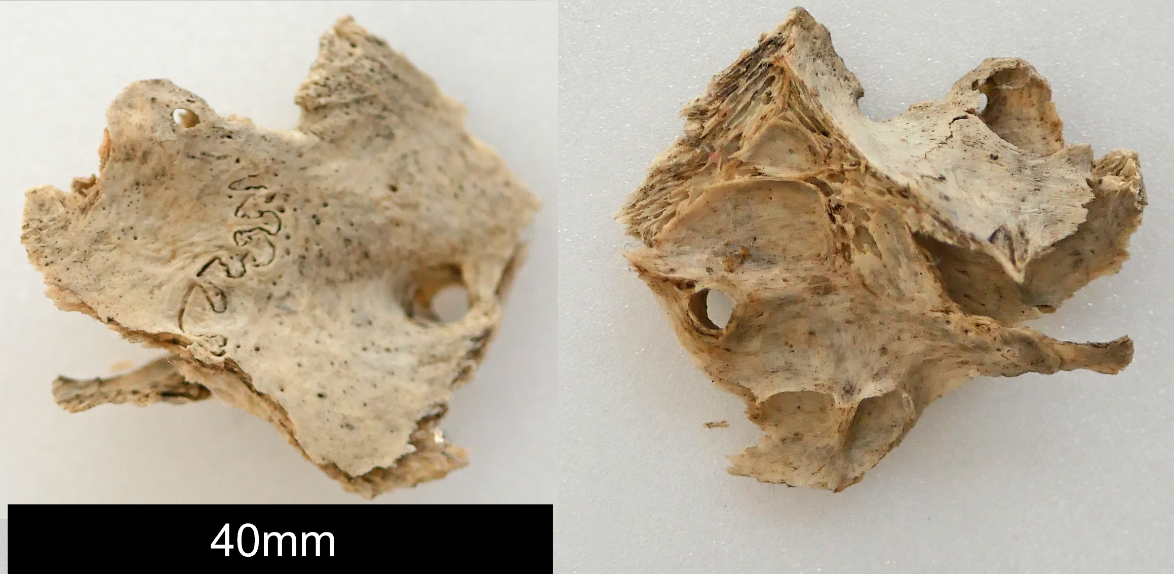 This feels right to me, since there aren’t many other parts of the skeleton consisting of fused bony plates containing foramina. But as to which bones of the skull and which animal, that’s a much more difficult identification prospect.