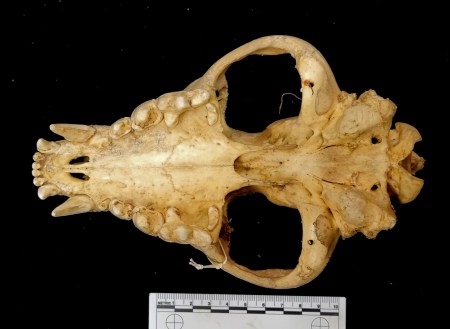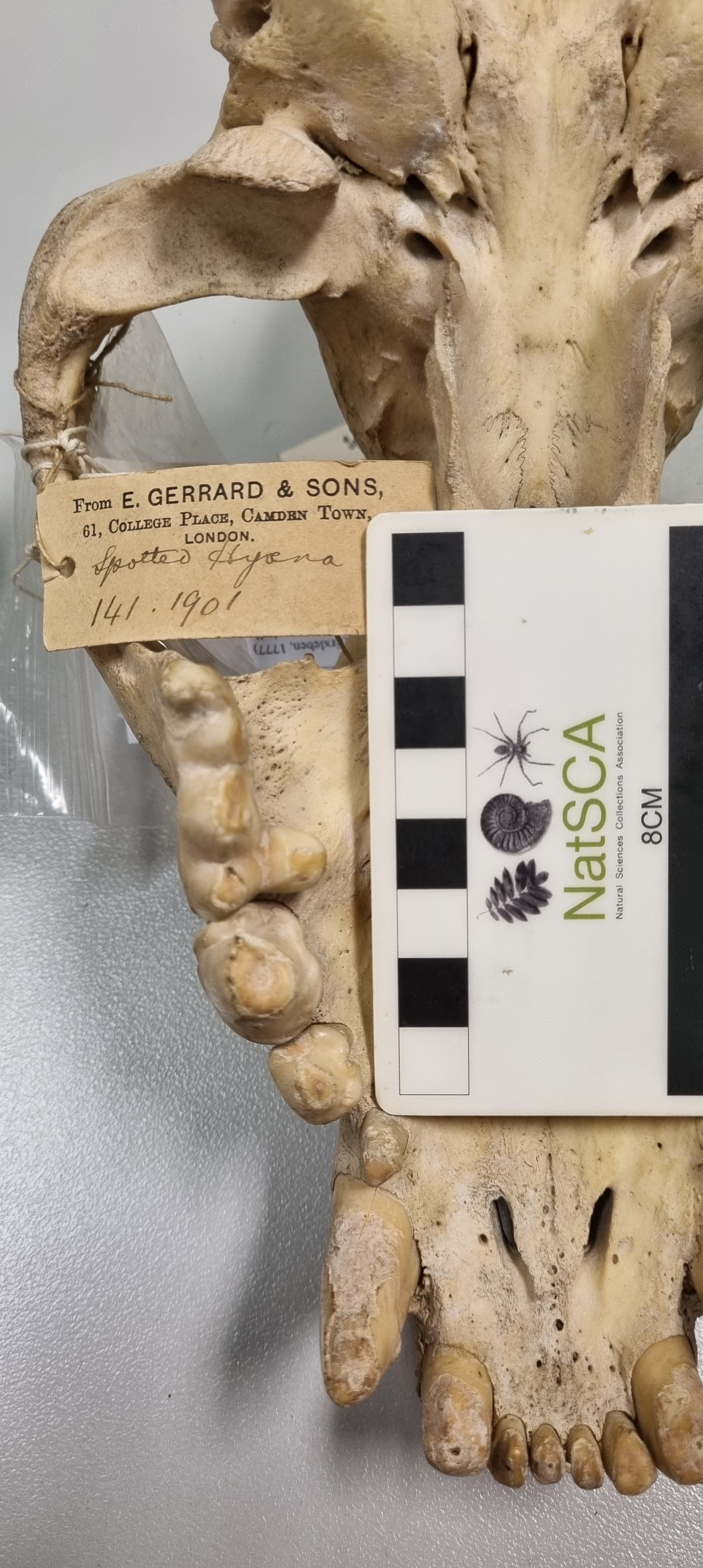 The label attached to this specimen indicated that this is the skull of a Leopard, which is clearly wrong. The label also identified the specimen as having been collected in East Africa by Major A.W.V. Plunkett.