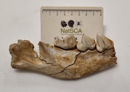This is a section of mandible from a Cave Hyena Crocuta crocuta spelaea Goldfuss, 1823. This jaw shows just three teeth, but they are very useful teeth for identification, since they are characteristically robust, with really heavy conical premolars with well defined cingula (those ridges of enamel near the base). Perfect for smashing through bones. The curve of the jaw is also a useful clue.
