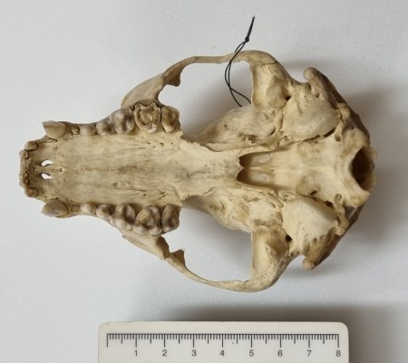 Most Raccoon skulls I’ve seen have been smaller and a lot more gracile than this chunkster, so when I first spotted this specimen it took me a moment to recognise the species. In particular, this specimen has very well-developed muscle scars around the zygomatic arches (cheekbones) and sagittal crest (the ridge along the midline of the braincase) compared to the younger specimens that I tend to see, such as this one from my handling collection: