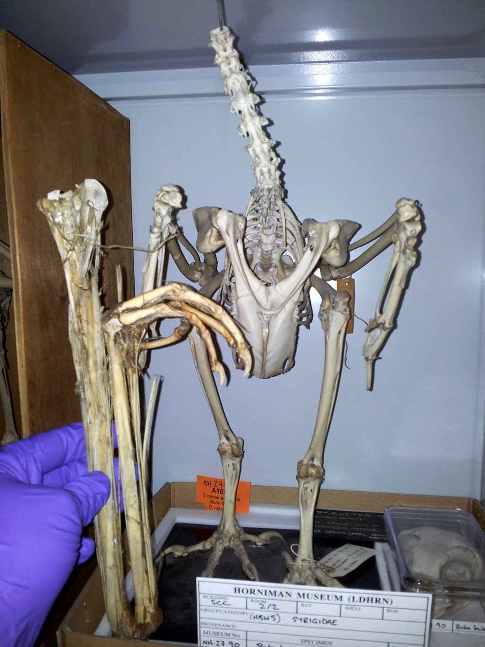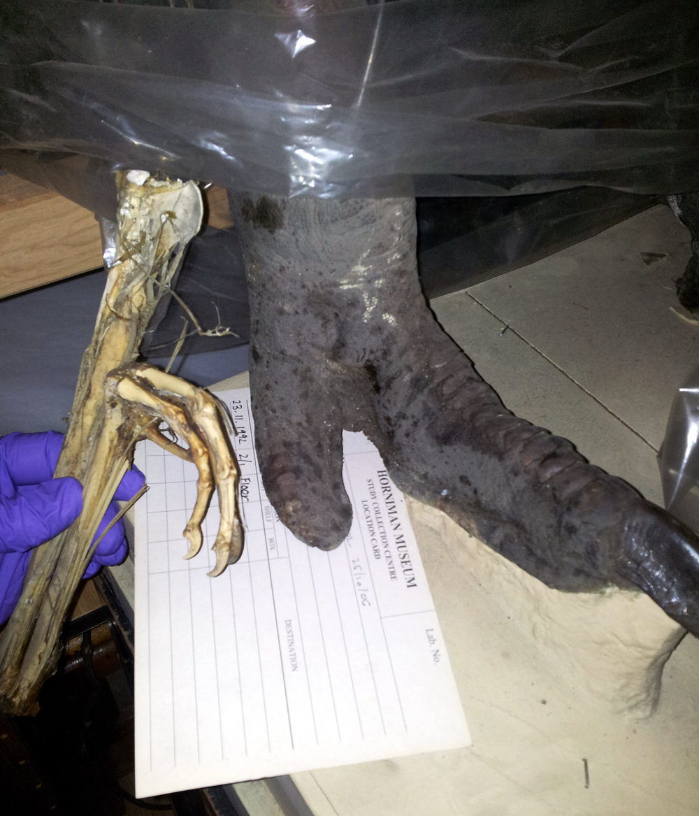 A Secretarybird was another common suggestion and it was the first possibility that I thought of myself. Secretarybirds use their long legs to walk the plains of Africa in hunt of prey, which they stamp and kick to death. However, when compared to a Secretarybird in the Horniman’s collection it proved to be different in the relative proportions of the tibiotarsus and tarsometatarsus and the total length to the toes:
