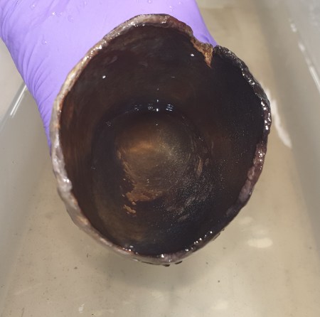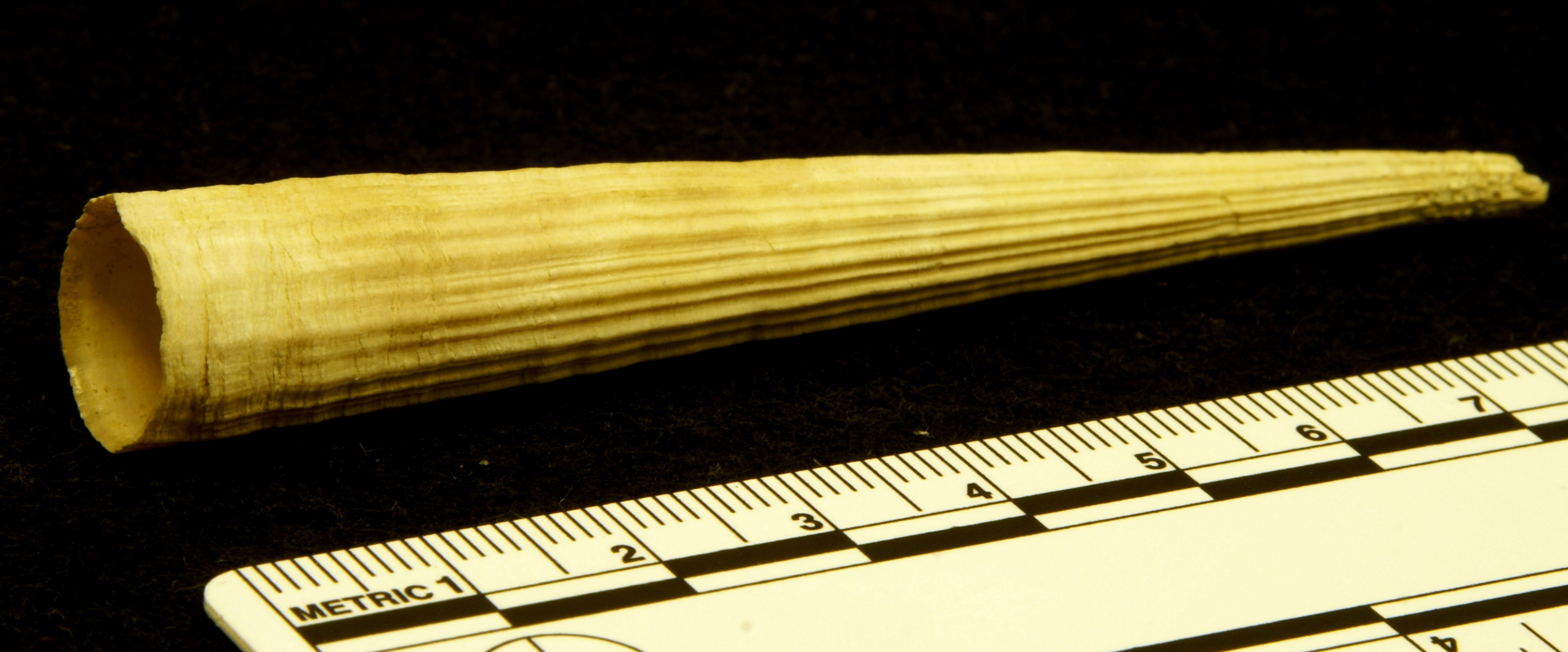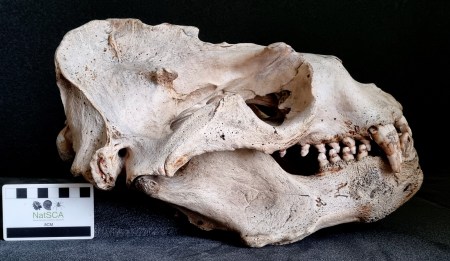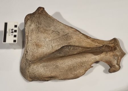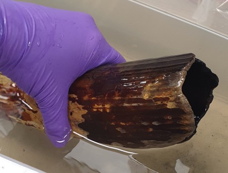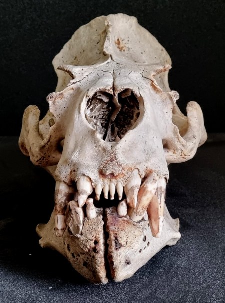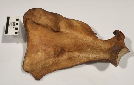 As you can see, this is part of the antler of a Reindeer Rangifer tarandus (Linnaeus, 1758) that still bears the velvet, which is the hairy outer layer of skin covering various layers of tissue. These include the perichondrium and periosteum, which surround and protect the cartilage and bone being grown by highly vascularised mesenchyme tissue and specialised cells such as chondrocytes and osteoblasts. These cells create a scaffold of cartilage that becomes mineralised to form the bone that makes up the antler.
