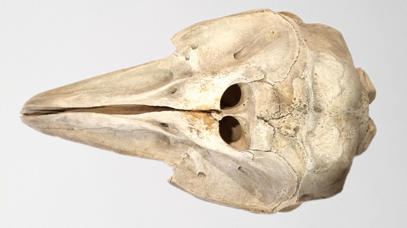 The mystery skull is in fact from a White-beaked Dolphin, Lagenorhynchus albirostris (Gray, 1846). This is a species that lives in cold North Atlantic waters, feeding on Cod and related fish. Well done to everyone who managed to work it out!