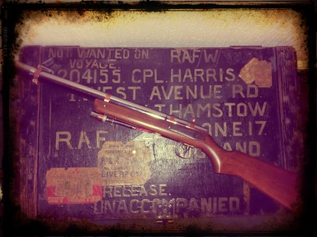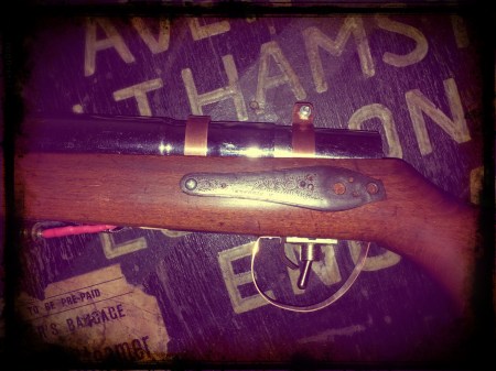 The barrel and mechanism housing are made from some old vacuum-cleaner tubing and a large washer, the stock is from an old air-rifle and the mountings were all hand made from bits of copper roofing strip that I bent into shape and attached with nuts and bolts, plus some old metal decorative plates I picked up in a junk shop.